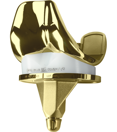 股骨髁和脛骨托分別有5個(gè)不同規(guī)格,并采用均勻分布骨水泥的內(nèi)表面結(jié)構(gòu)設(shè)計(jì)。材料為達(dá)到國(guó)際標(biāo)準(zhǔn)的鈷鉻鉬合金。聚乙烯襯墊有五個(gè)不同規(guī)格厚度,分別對(duì)應(yīng)每種股骨髁規(guī)格。BIOLOY® 鈦鈮涂層(黃金膝)